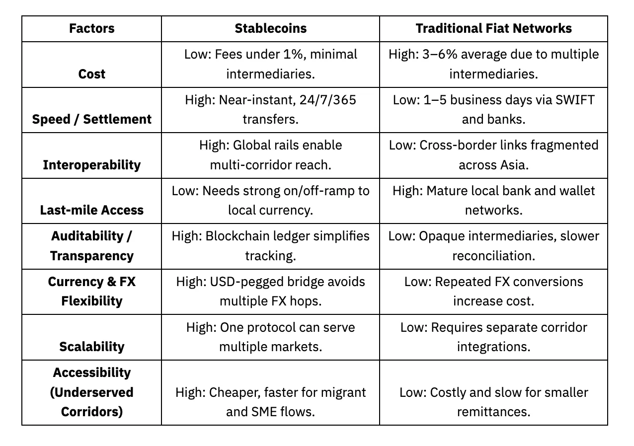 Local payment integrations — India's IMPS, Indonesia's clearing networks, and equivalents across the region — connected to global stablecoin liquidity.